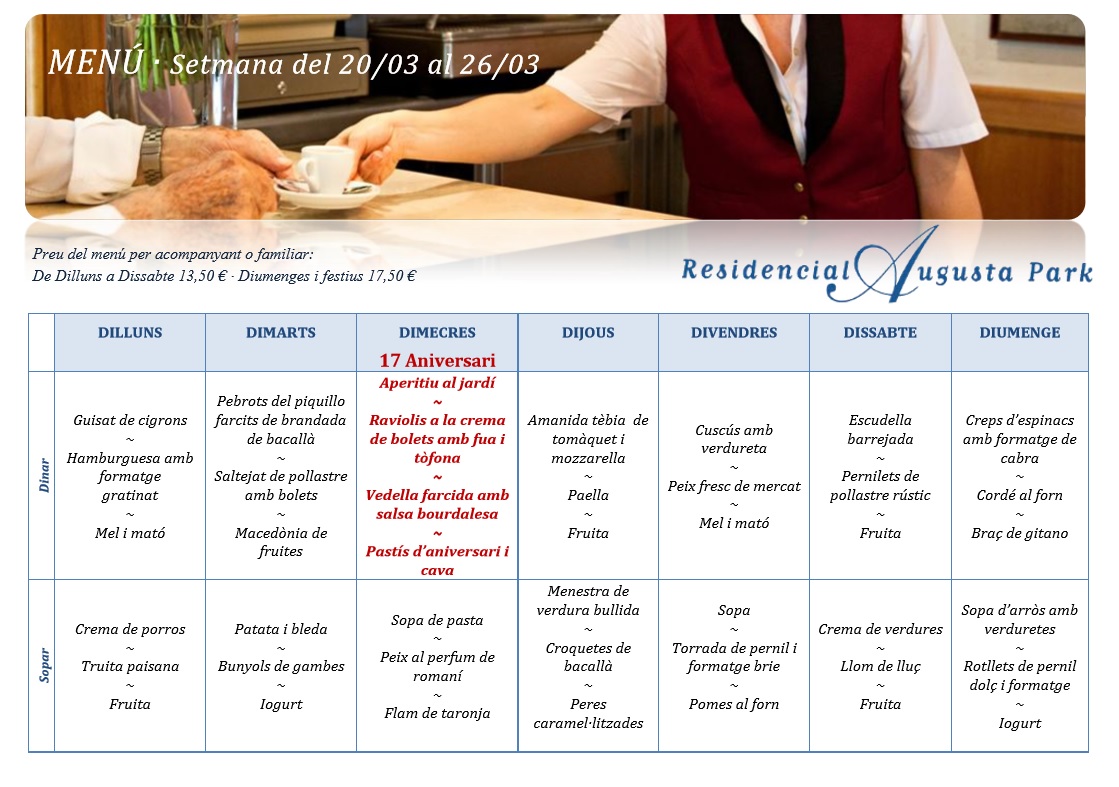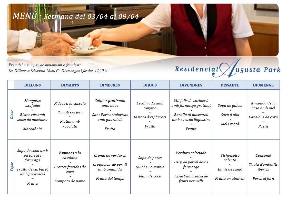 06 Mar, 2017 By Augusta Park Menú · setmana del 6 al 12 de març Menú setmanal Residencial Augusta Park.