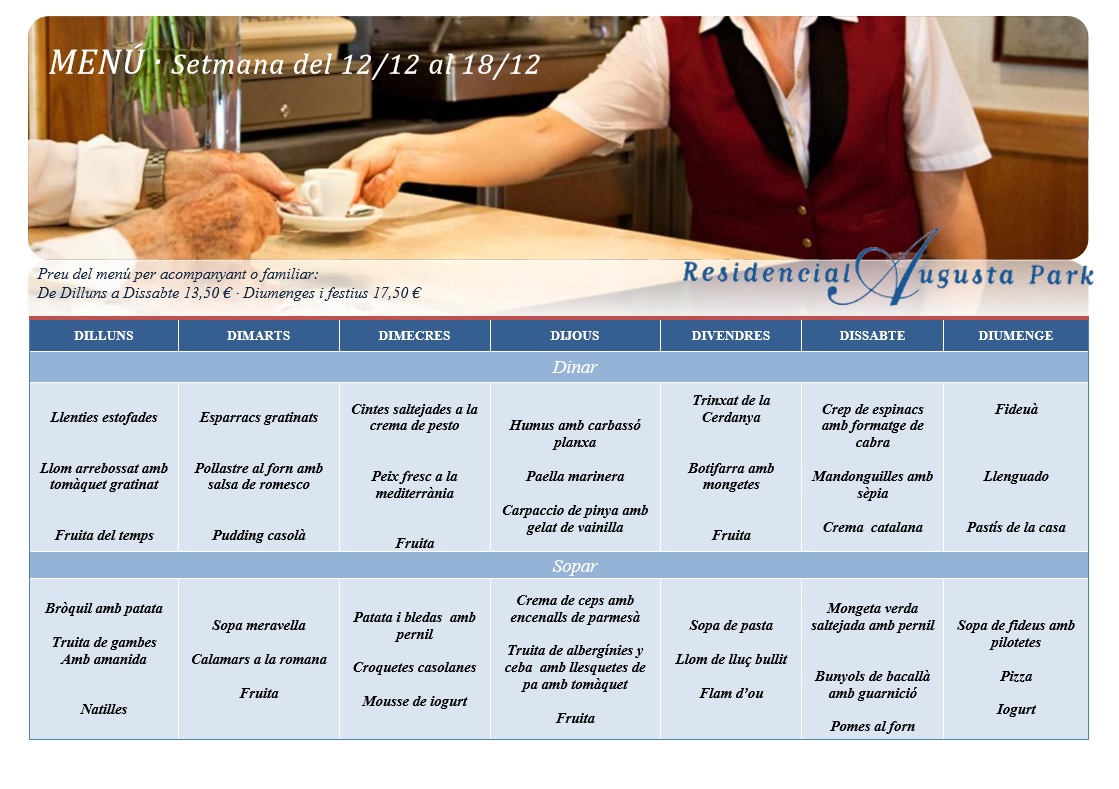 01 Dic, 2016 By Augusta Park Menú de les festes de Nadal 2016·17 Menú de les festes de Nadal a Residencial Augusta Park. Descàrrega en PDF: menu-augusta-festes
